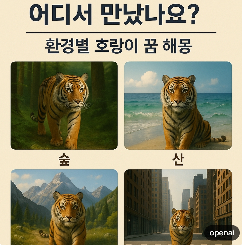 꿈속 배경은 내 삶의 무대이자, 심리적 상태를 상징합니다. 숲, 강가, 산 정상, 바닷가, 들판, 도시, 집, 동굴… 각기 다른 환경에서 만난 호랑이는 또 다른 메시지를 전하죠. 내가 머무는 공간이 전하는 의미를 따라, 꿈의 해석을 넓혀보시죠.